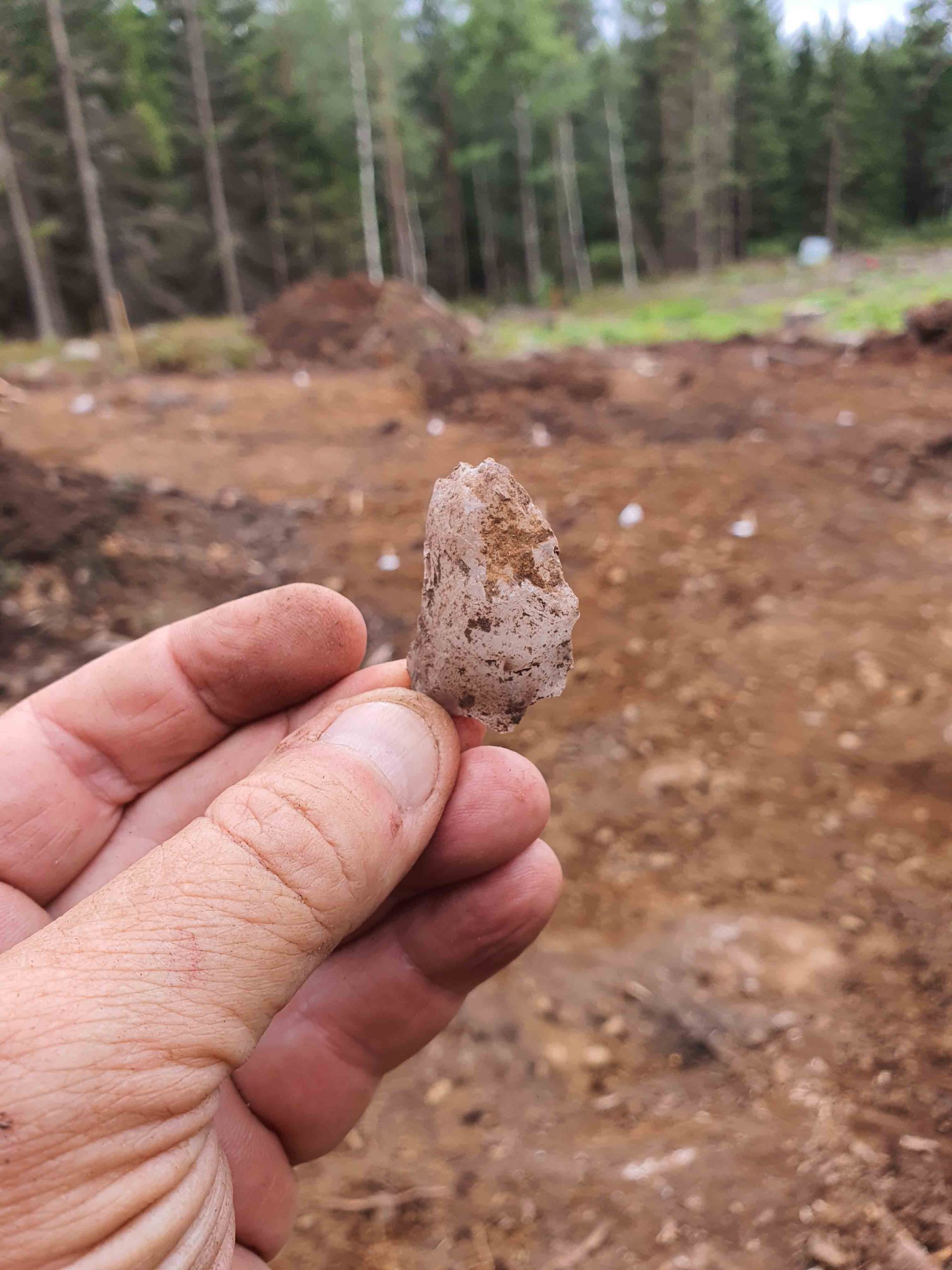 Nyligen avslutades schaktningsarbetet där vi avlägsnade all växtlighet som täckte den underliggande moränen. Här hittar vi rester efter redskapstillverkning i form av slagen kvarts, men också några avslag av grönsten och ett mikrospån av kambrisk flinta. Från en tidigare förundersökning har vi dessutom två trindyxor kopplade till boplatsen.
