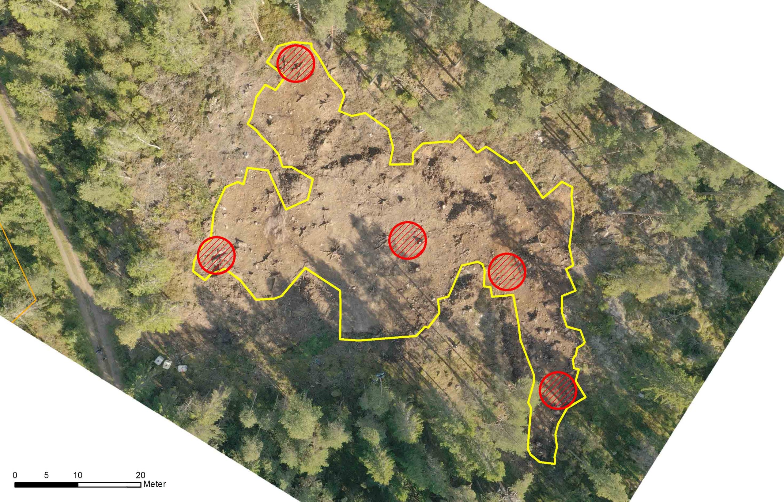 Flygfoto med framschaktad yta och fyndkoncentrationer.